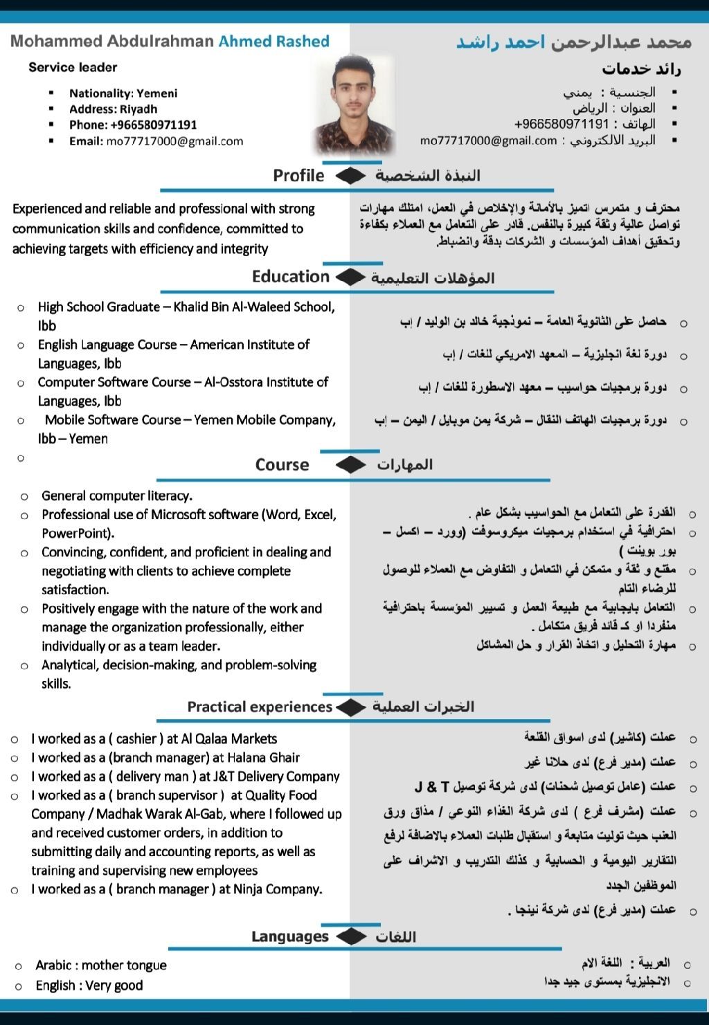 أنا محمد، يمني الجنسية، لدي خبرة في مجال الحلويات كبائع ومشرف صالة، وعملت أيضا في مجال ورق العنب والمحاشي. متواجد حاليا في الدمام واقامتي مجددة، ولا أمانع التنقل بين المدن حسب متطلبات العمل. أرفق لكم سيرتي الذاتية