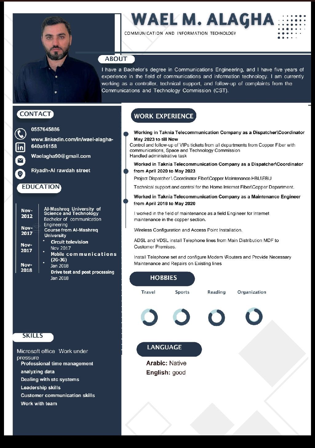 أنا وائل محمد ألاغا خريج هندسة اتصالات بدأت مسيرتي المهنية كفني اتصالات ومن بعدها اكتسبت خبرة في المجال ثم ترقيت حتى وصلت الى منسق كنترول وطورت من نفسي خلال فترة عملي في الاتصالات ولدي القدرة على التعامل مع الايميلات، والرد بشكل احترافي والتعامل مع عملاء الشكاوى ومتابعة العمل مع القسم الميداني وأنا شخص ملتزم وأحب الشغل المنظم من نقاط قوتي اعمل تحت الضغط بدون أن يؤثر على مسار العمل وجودته