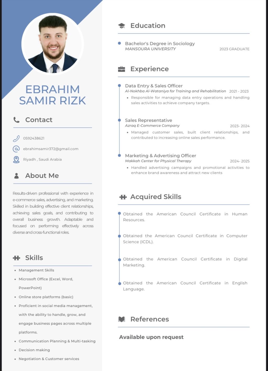 ابحث عن فرصة عمل مقيم في الرياض ليسانس أداب علم اجتماع حيث عملت في شركة النخبة الوطنيه لتدريب والتأهيل مدخل بيانات ومسؤول مبيعات من فترة 2021 الى 2023 عملت في شركة أزرق لتجارة الالكترونية سيلز من فترة 2023 الى 2024 عملت مسؤول دعاية واعلان لمركز مكة الطبي للعلاج الطبيعي من 2024 الى 2025