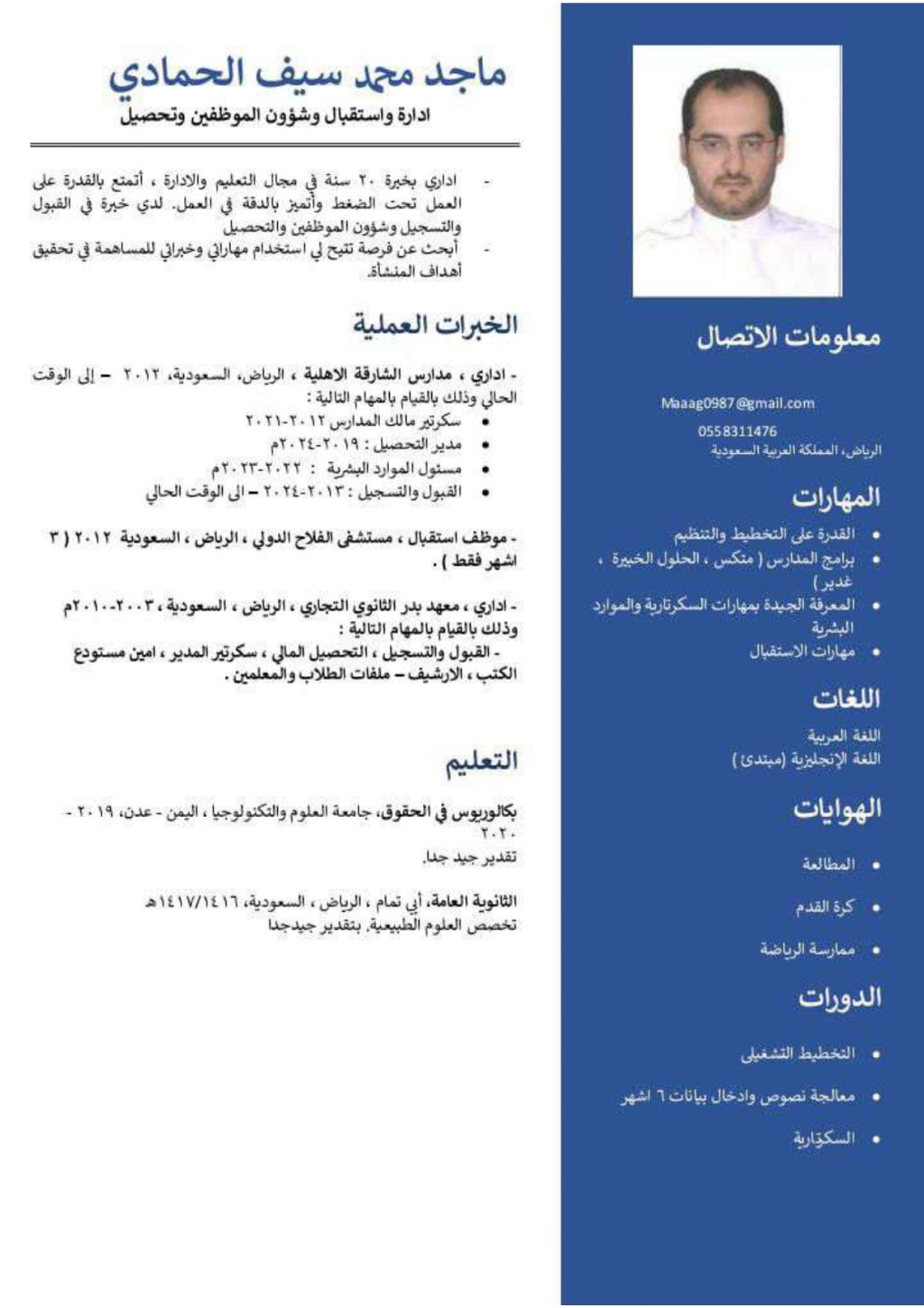 يطلب عملا اداريا أو ميدانيا بكالوريوس قانون ودورات في السكرتارية ومعالجة نصوص وأعمال مكتبية عملت كاداري بمدارس أهلية لمدة 24 سنة (بوظائف سكرتير وموظف استقبال وأمين صندوق ومحصل مالي وأعمال قانونية خاصة بالمدارس) إقامة نظامية ورخصة قيادة سارية