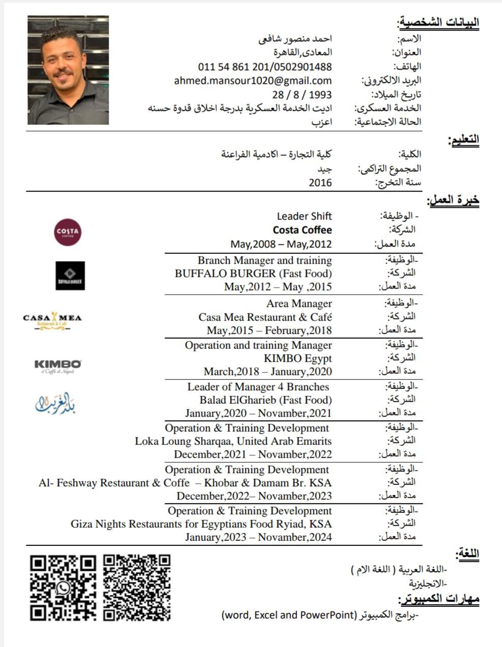 Operations and training manager and restaurant and cafe development consultant in Riyadh study of Business Administration and Accounting Ability to develop restaurants and cafes Engineering menu reference and control of assignments Work of a rasib Applying the rules of withdrawal from stock and orders while reducing expenses Training the administrative staff and employees on the food system