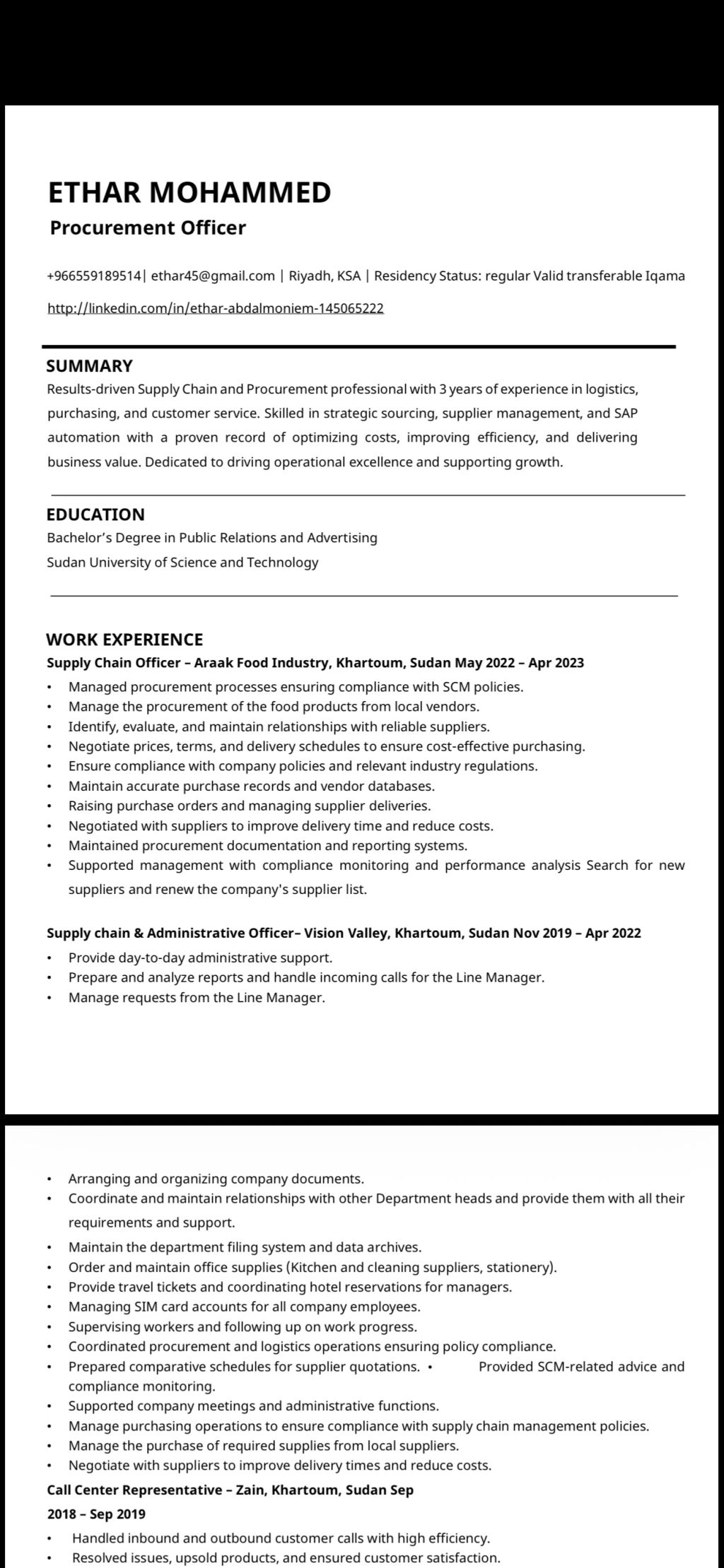 شابة سودانية الجنسية متواجدة في الرياض لدي اقامة قابلة للنقل ابحث عن فرصة عمل وعندي خبرة ثلاثة سنين في مجال أل administration & supply chain وامتلك مهارات العمل في برامج أل Ms office وأنظمة أل ERP مثل (SAP & Odoo) ومهارات أخرى فعاله في ادارة وتنظيم العمل مثل communication skills, Procurement & Supply Chain Compliance, document control and records, Communication & Coordination, problem - solving
