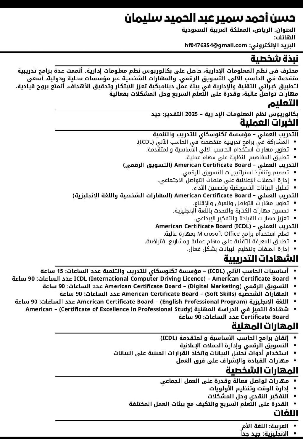 Seeking an Administrative Position - Riyadh I am Hassan Ahmed Samir Abdelhamid Sulaiman, holding a Bachelor’s degree in Management Information Systems (2025) I have strong experience in administrative work, data entry, customer service, and digital marketing. I also hold several international certificates, including ICDL, Digital Marketing, Soft Skills, and English Professional Program. Locati
