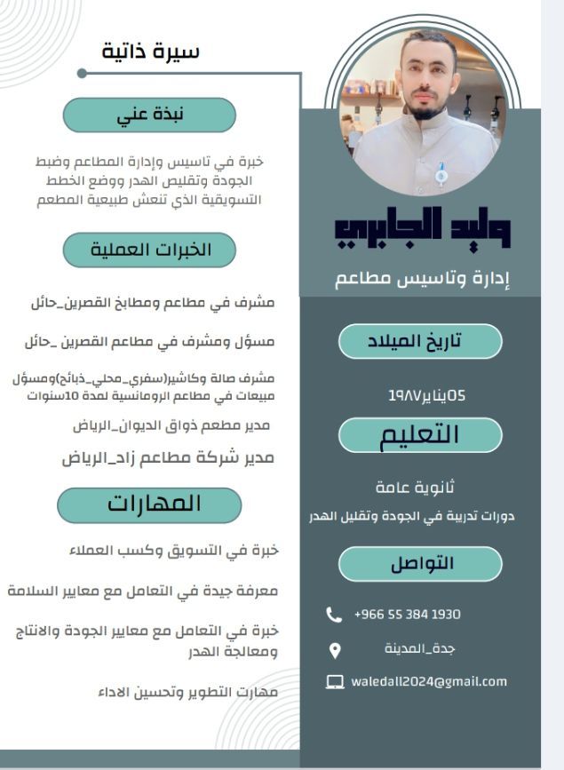 ابحث عن فرصة عمل خبرة في المطاعم 15 سنة منه 10 سنوات في شركة الرومنسيه جميع المجاملات قسم الانتاج والمبيعات وقسم الشكوى في الادارة خبرة كامل مدير مطعم ذواق الديون مدير في شركة زاد بلدي وفي مطاعم القصرين حائل أخذت دورت تدريبية متنوعه في أنماط العملاء والجودة والتكليف وتقليل الهدر حاليا متفرغ