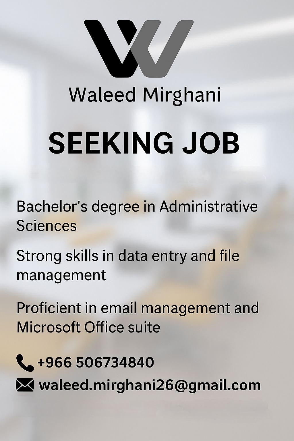 My name is Waleed. I hold a Bachelor’s degree in Management Studies, in addition to short courses in administrative skills and HRM. I have intermediate computer skills and experience with Microsoft Office applications (Word, Excel, and PowerPoint) as well as strong skills in email management and report preparation. I am hardworking, organized, and a fast learner. Phone number for calls and