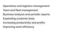 Operations and logistics management Team and fleet management Business analysis and periodic reports Expanding customer base Increasing productivity and profits Improving work efficiency