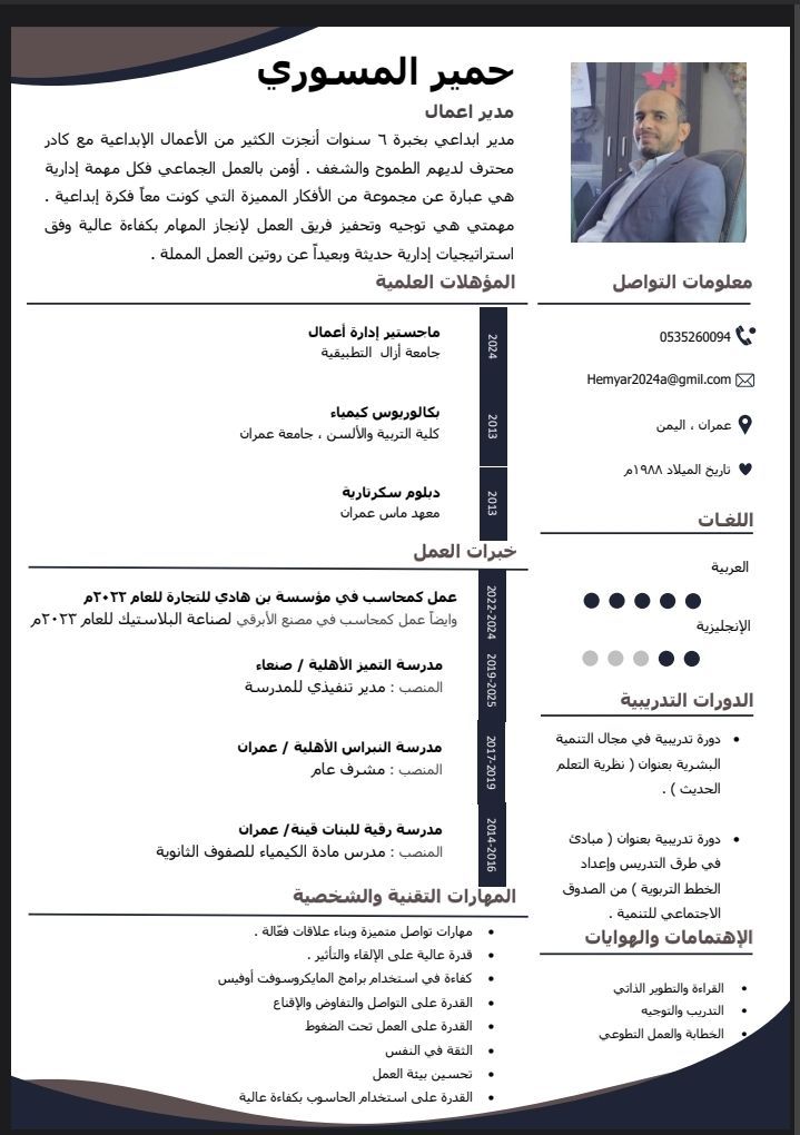 حمير علي محمد الم سوري يمني الجنسية ابحث عن فرصة عمل في جانب الإدارة (محاسب. كاشير. مشرف. مدير مبيعات. مدير مشتريات. مدير تسويق. أي عمل اداري)