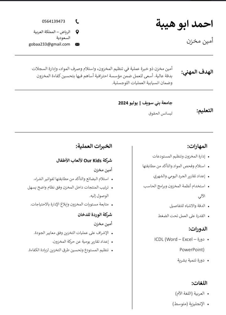 باحث عن عمل - أمين مخازن ابحث عن فرصة عمل ك أمين مخازن، لدي القدرة على تنظيم المخزون، الجرد، استلام وتسليم البضائع، والتعامل مع فواتير الادخال والاخراج. جاهز للعمل فورا والتعلم السريع