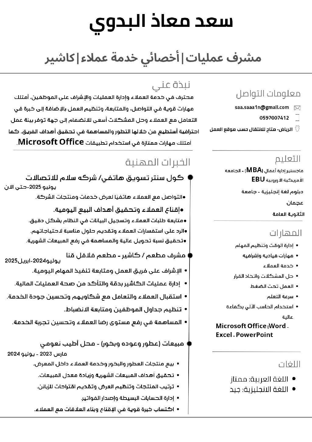 لدي شهادة ماجستير إدارة أعمال ابحث عن عمل خبرة في 1 خدمة العملاء. 2 مشرف مطاعم 3 مبيعات 4 إدارة 5 خبرة في تطبيقات (Word - Excel) مواليد السعودية