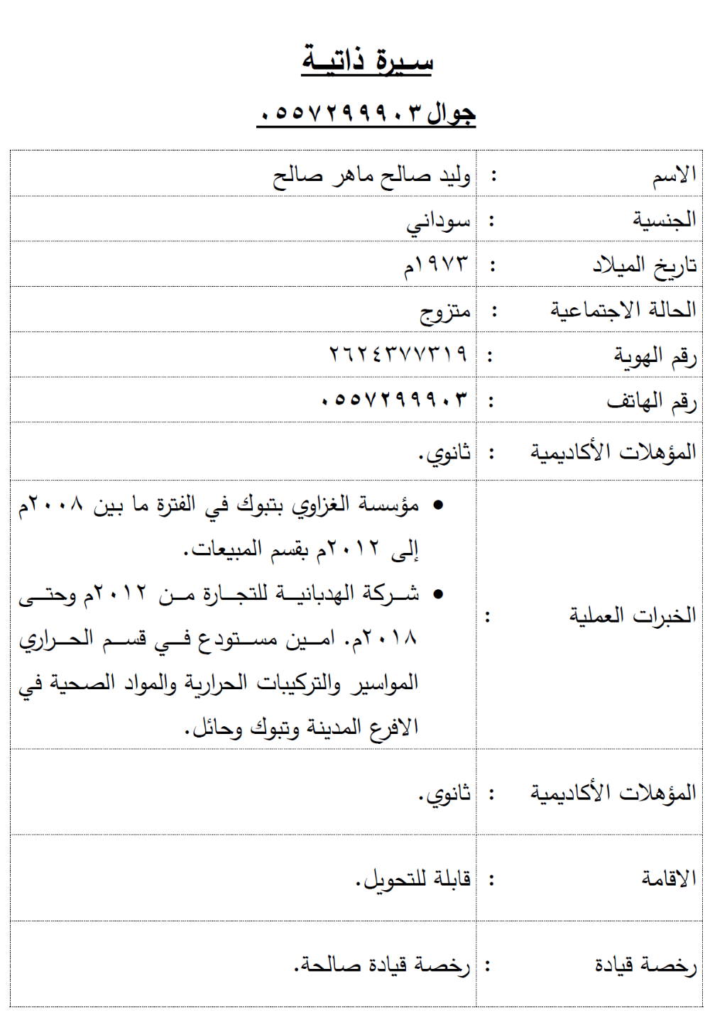 This is Alwaleed Saleh Maher, Sudanese nationality. I am a Warehouse keeper & a Driver looking for a job. I have experience and a transferable Iqama and a valid Saudi Driver's License