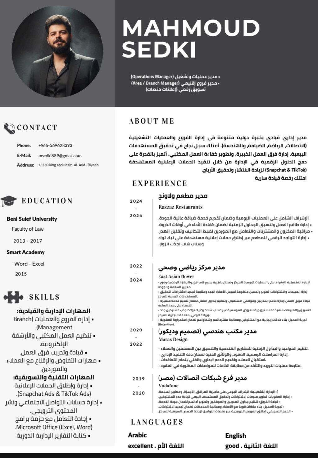 مدير اداري قيادي بخبرة دولية متنوعة في إدارة الفروع والعمليات التشغيلية الاتصالات الرياضة الضيافة والهندسة) امتلك سجل نجاح في تحقيق المستهدفات البيعية إدارة فرق العمل الكبيرة، وتطوير كفاءة العمل المكتبي. أتميز بالقدرة على دمج الحلول الرقمية في الإدارة من خلال تنفيذ الحملات الاعلانية المستهدفة (Snapchat & TikTok لزيادة الانتشار وتحقيق الأرباح. امتلك رخصة قيادة سارية