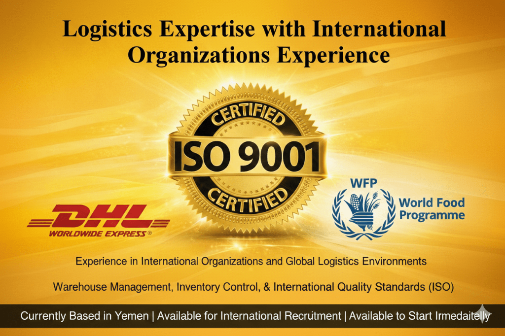 Are you looking for reliable international expertise I have worked as a Warehouse Officer with Un - affiliated organizations such as the World Food Programme (WFP) and with global logistics companies like DHL, adhering to the highest international quality standards. I am ISO 9001 certified, experienced in inventory control and logistics operations, currently based in Yemen, and available for international
