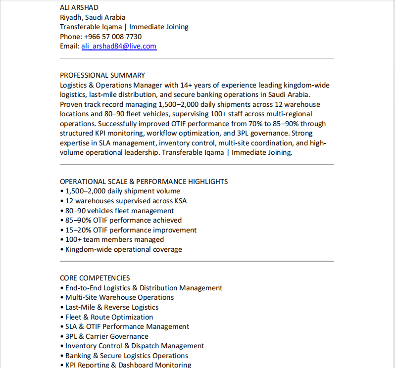 Logistics Manager Riyadh 14 Years KSA 2000 Shipments/ Day 12 Warehouses Transferable Iqama Immediate Joiner Logistics & Operations Manager with 14 + years of experience in Saudi Arabia, managing kingdom - wide logistics and last - mile operations. Proven track record handling 1500 - 2000 shipments per day, supervising 12 warehouse locations, managing 80 - 90 fleet vehicles, and leading 100 + staff