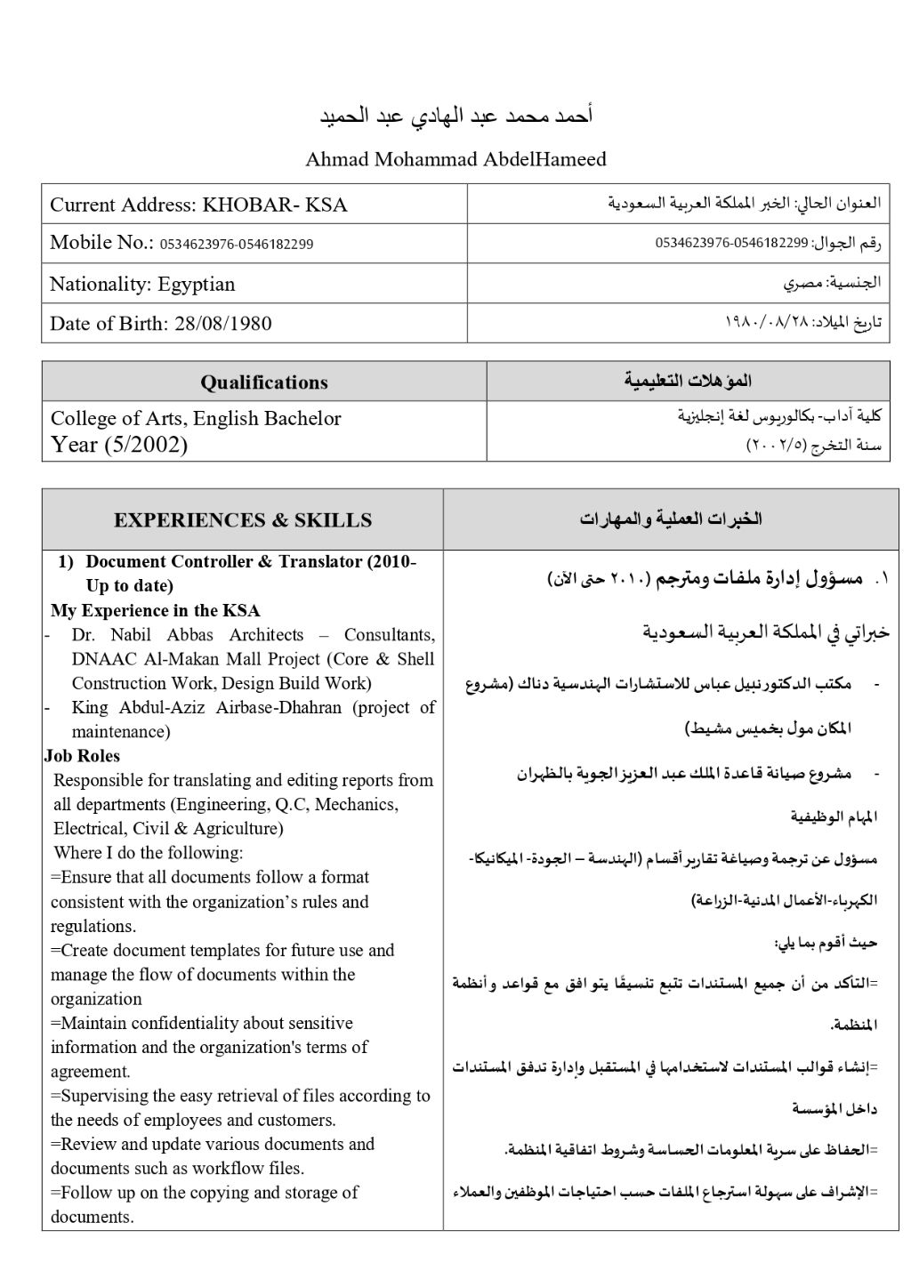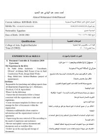 1) Document Controller & Translator (2010 - Up to date) My Experience in the KSA - Dr. Nabil Abbas Architects - Consultants, DNAAC Al - Makan Mall Project (Core & Shell Construction Work, Design Build Work) King Abdul - Aziz Airbase - Dhahran (project of maintenance) Job Roles Responsible for translating and editing reports from all departments (Engineering, Q C Mechanics, Electrical, Civil & Agriculture)