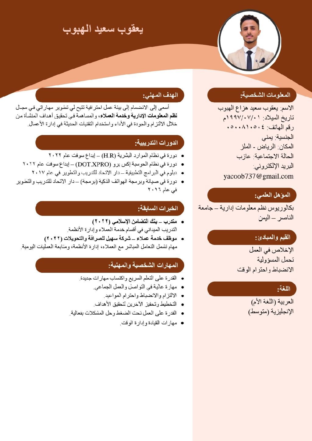 بكالوريوس نظم معلومات ادارية لدي الخبرة في إدارة الأنظمة وخدمة العملاء ومتابعة العمليات اليومية والكثير من الدورات التدريبية المذكورة في السيرة الذاتية المرفقة