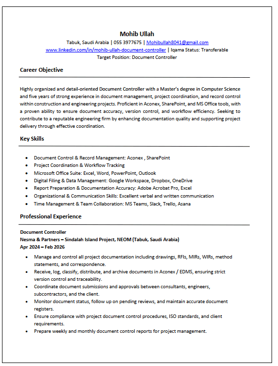 Open to Work Document Controller Dear Hiring Managers, I am actively seeking opportunities as a Document Controller. With 5 + years of experience in construction and engineering projects, I specialize in document control, Aconex/ EDMS, and maintaining accurate records while ensuring smooth and efficient workflows. Currently working with Nesma & Partners on the NEOM project, I manage project documentation