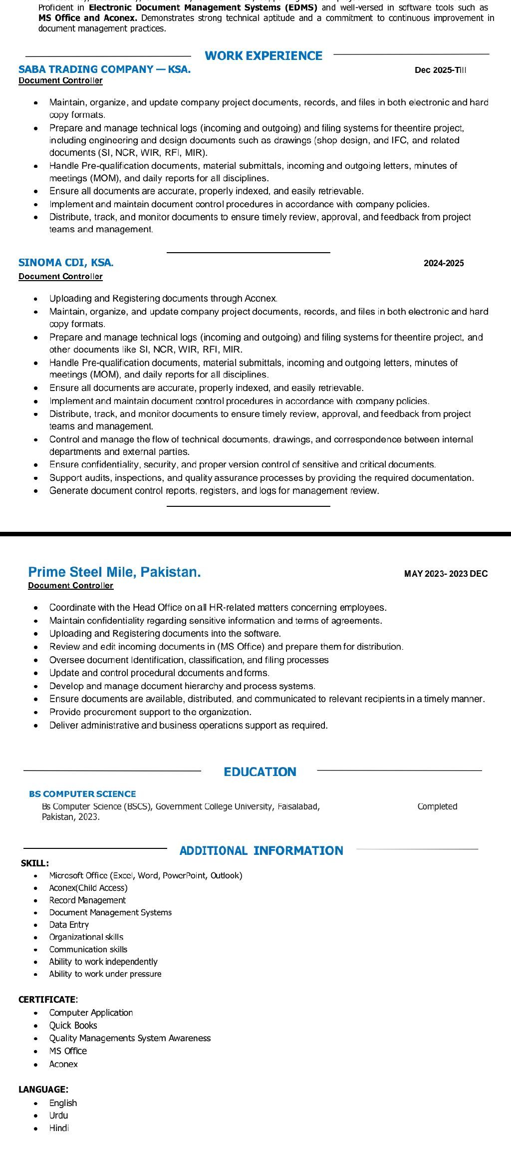 Am looking for a job as a Document Controller I am Skilled in receiving, reviewing, logging, and archiving documents, handling engineering/ project drawings and reports with strong control over registers, version management, and approvals. Proficient in Aconex, Folderit, Google Sheets, MS Word, and Excel. Experienced in RFIs, WIRs, MIRs, NCRs, SI, material submittals, correspondence, and MOM while