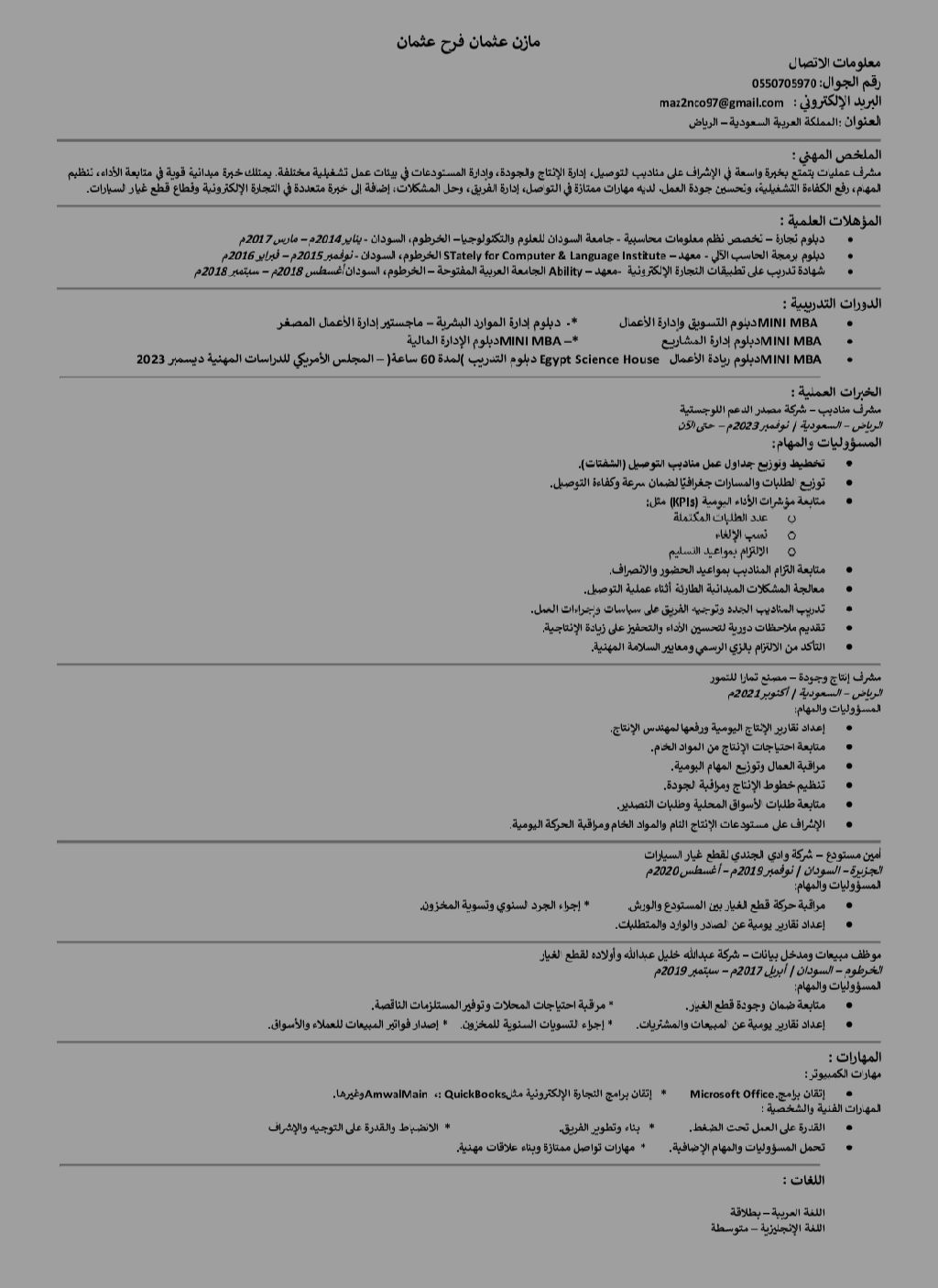 سوداني مقيم ابحث عن عمل supervisor في المجالات اللوجستية أو أي نطاق آخر في الرياض