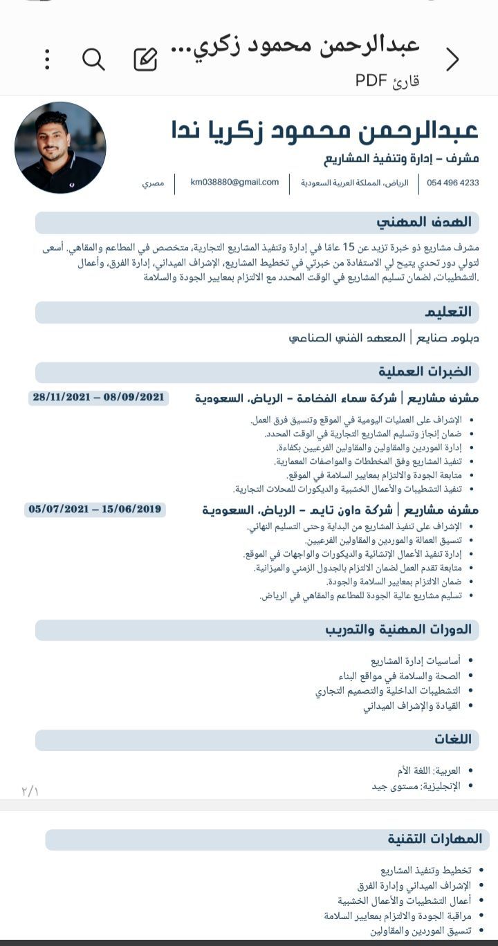 مشرف مشاريع ذو خبرة تزيد عن 15 عاما في إدارة وتنفيذ المشاريع التجارية، متخصص في المطاعم والمقاهي أسعى لتولي دور تحدي يتيح لي الاستفادة من خبرتي في تخطيط المشاريع الاشراف الميداني، إدارة الفرق، وأعمال التشطيبات لضمان تسليم المشاريع في الوقت المحدد مع الالتزام بمعايير الجودة والسلامة