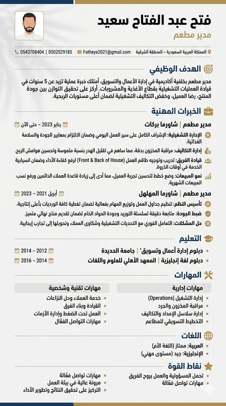 مدير مطعم بخبرة عملية في إدارة وتشغيل المطاعم، أسعى للانضمام الى بيئة عمل احترافية أساهم من خلالها في تحسين الأداء التشغيلي، رفع جودة الخدمة، وزيادة المبيعات، مع تطوير مهاراتي القيادية والادارية بشكل مستمر