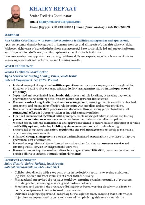 Summary Operations and Maintenance Professional with over 10 years of experience in elevator maintenance and installation, facilities management, logistics coordination, and administrative control across the Kingdom of Saudi Arabia and Egypt. Throughout my career, I have been responsible for leading technical teams, managing contracts, operating multi - site locations, and building strong, sustainable