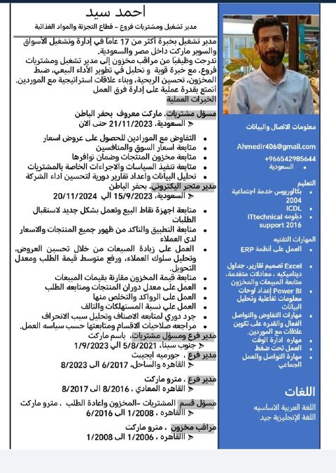 مدير فروع ومشتريات مواد غذائية / محلل بيانات خبرة أكثر من 17 عاما في قطاع التجزئة متخصص في إدارة التشغيل تطوير المبيعات، تقليل العجز والهالك وضبط المخزون. خبرة في قيادة الفرق، اعداد وتحليل التقارير، ومتابعة مؤشرات الأداء (KPIs) اجادة أنظمة ERP وExcel ابحث عن عمل داخل المملكة