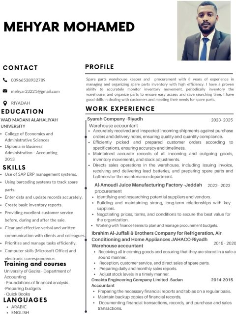 ياسر سيد محمد صالح. سوداني الجنسية خبرة أكثر من 5 سنوات بإدارة المستودعات والمشتريات إقامة قابلة للنقل ورخصة قيادة سارية ابحث عن فرصة عمل