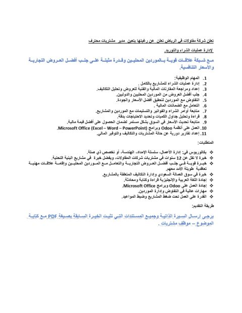 اعلان وظيفي - مدير مشتريات (خبرة 12 سنوات فأكثر) الموقع الرياض حي الياسمين، السعودية القطاع مقاولات تعلن شركة مقاولات في الرياض تعلن عن رغبتها بتعين موظف مشتريات محترفلإدارة عمليات الشراء والتوريد مع شبكة علاقات قوية بالموردين المحليين وقدرة مثبتة على جلب أفضل العروض التجارية والأسعار التنافسية