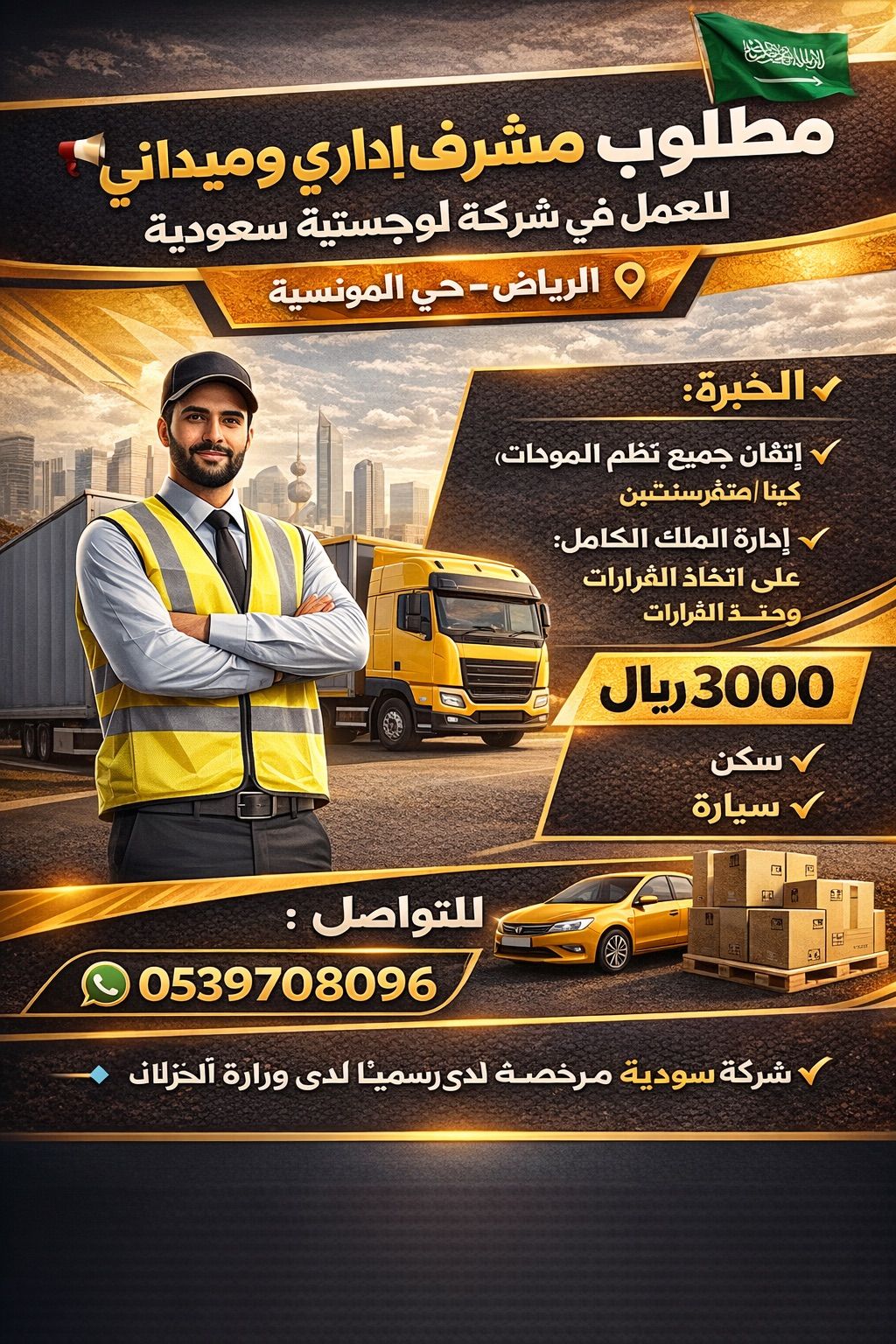 مطلوب مشرف اداري وميداني للعمل في شركة لوجستية في الرياض حي المونسية لديه الخبرة في جميع الداشبورد المتعلقة بالتوصيل ويجيد عمل التقارير المطلوبه منه والمتابعة ويكون قوي الشخصية قادر علي اتخاذ القرارات براتب 3000 ريال متوفر سكن وسيارة