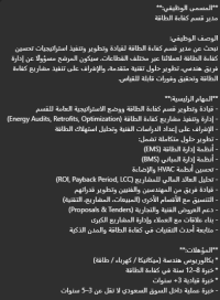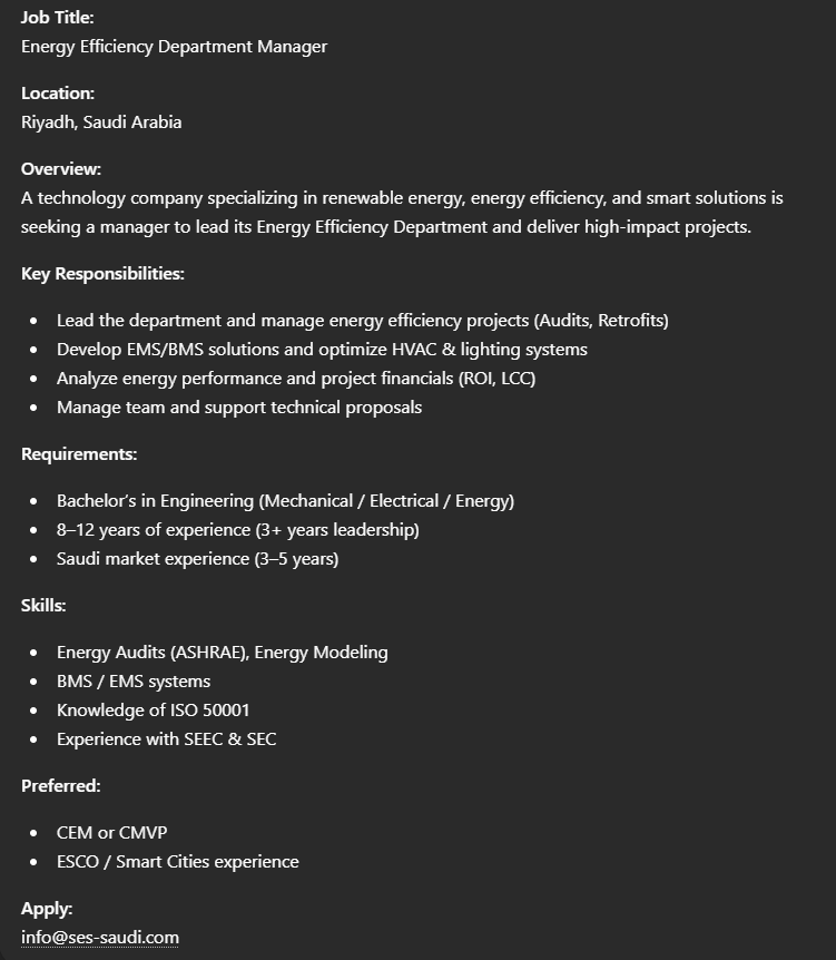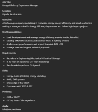 Job Title Energy Efficiency Department Manager Key Responsibilities Lead the department and manage energy efficiency projects (Audits, Retrofits) Develop EMS/ BMS solutions and optimize HVAC & lighting systems Analyze energy performance and project financials (ROI, LCC) Manage team and support technical proposals Requirements Bachelor’s in Engineering (Mechanical/ Electrical/ Energy) 8 - 12 years