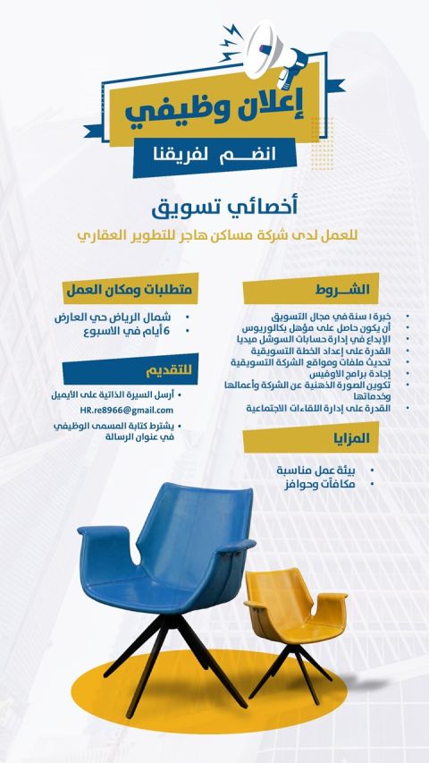 مطلوب أخصائي تسويق للعمل في شركة تطوير عقاري داخل مدينة الرياض. الشروط خبرة لا تقل عن سنة بأعمال التسويق العقاري، وللتقديم أرسل سيرتك الذاتية على الايميل، مقر الشركة الرياض حي العارض شارع خيبر