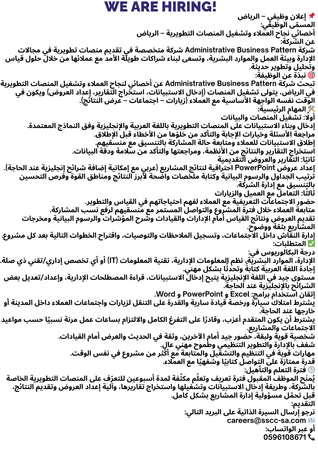 اعلان وظيفي - الرياض المسمى الوظيفي أخصائي نجاح العملاء وتشغيل المنصات التطويرية - الرياض عن الشركة شركة Administrative Business Pattern شركة متخصصة في تقديم منصات تطويرية في مجالات الإدارة وبيئة العمل والموارد البشرية، وتسعى لبناء شراكات طويلة الأمد مع عملائها من خلال حلول قياس وتحليل وتطوير حديثة. نبذة عن الوظيفة تبحث شركة Administrative Business Pattern عن أخصائي لنجاح العملاء وتشغيل المنصات في