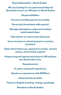 Payroll Specialist - Riyadh, Al Murabba, Saudi Arabia. Send the CVs by email only. We are looking for an experienced Payroll Specialist to join our HR team in Riyadh, Al Murabba. The ideal candidate should have a minimum of 3 years of payroll experience and hands - on experience with ERPNext. Key Responsibilities Process monthly payroll accurately and on time. Reconcile timesheets with payroll to ensure