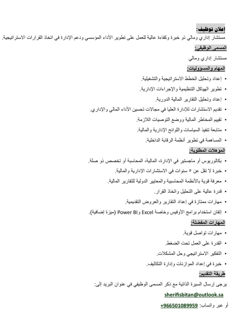 مطلوب مستشار اداري ومالي ذو خبرة وكفاءة عالية للعمل على تطوير الأداء المؤسسي ودعم الإدارة في اتخاذ القرارات الاستراتيجية. التفاصيل رجاءا انظر الصورة المرفقة العنوان الرياض حي الملز ملاحظة هامة برجاء الالتزام فيما ورد في الاعلان وعلى أن يكون التواصل