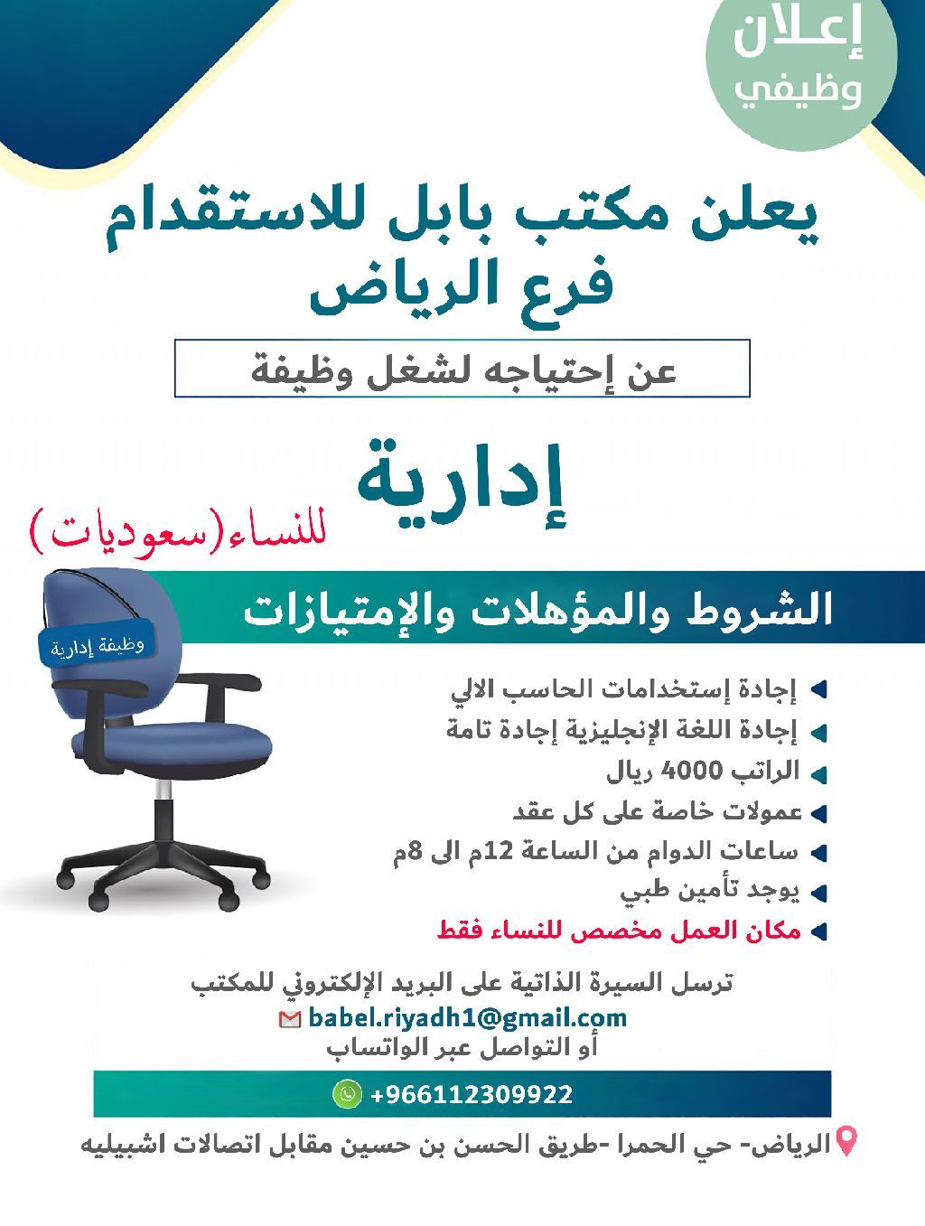 للباحثات عن عمل 0 للنساء (سعوديات) فقط مطلوب موظفة اداري - تتوفر بها الشروط التالية 1. اجادة اللغة الانجليزية اجادة تامة (شرط أساسي) العمل بمكتب استقدام (الرياض - حي الحمراء) بفترة واحدة من الساعة 12م - 8م إجازة الأسبوع يوم الجمعة فقط الراتب 4000 ريال تأمين طبي عمولات خاصه ع كل عقد ارسال السير الذاتية عبر الواتساب الرقم