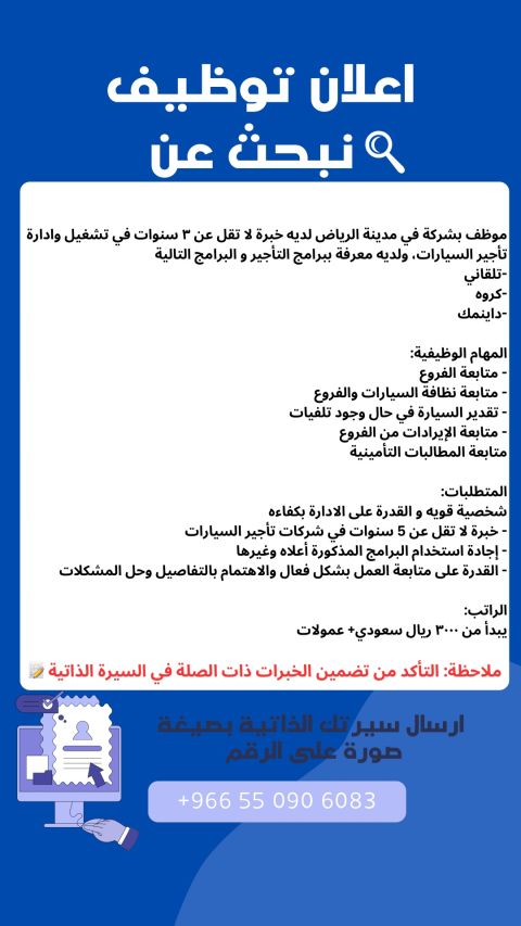 مطلوب موظف 1 دوام كامل بشركة في مدينة الرياض، الحمراء لديه خبرة لا تقل عن 3 سنوات في تشغيل شركات تأجير السيارات