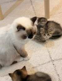 3 قطط صغيرة للبيع في الرياض، العمر شهر ونصف، ألام himalayan rag doll، والأب scottish fold ear
