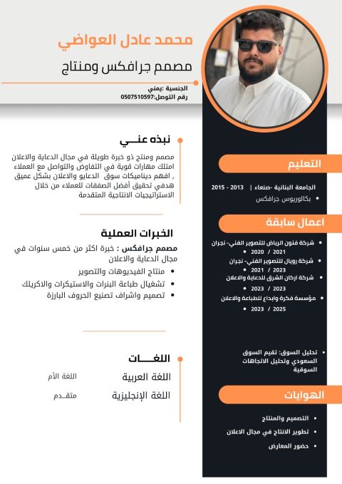 الاسم مهند اليوسفي الجنسية يمني ابحث عن فرصة عمل في مجال التصميم الجرافيكي والتصوير والمونتاج. امتلك خبرة ومهارة في انشاء التصاميم الابداعية، وتحرير الصور والفيديوهات بجودة عالية، واستخدام البرامج الاحترافية مثل Adobe Photoshop Adobe Illustrator Adobe Premiere Pro After Effects أتميز بالدقة، والالتزام بالمواعيد، والقدرة على تحويل الأفكار الى أعمال مرئية جذابة واحترافية