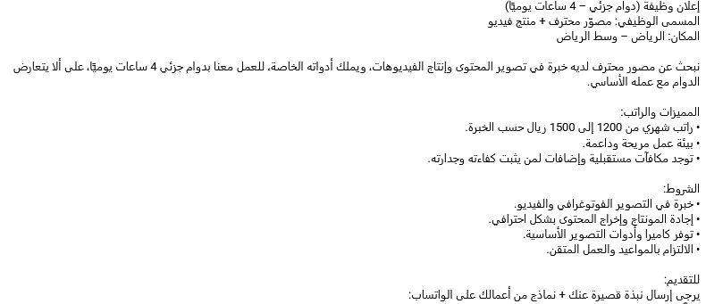 اعلان وظيفة (دوام جزئي - 4 ساعات يوميا) المسمى الوظيفي مصور محترف منتج فيديو المكان الرياض - وسط الرياض حي الصفا نبحث عن مصور محترف لديه خبرة في تصوير المحتوى وانتاج الفيديوهات، ويملك أدواته الخاصة، للعمل معنا بدوام جزئي 4 ساعات يوميا على الا يتعارض الدوام مع عمله الأساسي. المميزات والراتب راتب شهري من 1200 الى 1500 ريال حسب الخبرة. بيئة عمل مريحة وداعمة. توجد مكافآت مستقبلية واضافات لمن