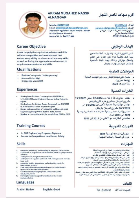 مهندس مدني متواجد في الرياض خبرة 3 سنوات منها سنتين في السعودية خبرة في أعمال الخرسانات عظم وتشطيب استلام وتسليم جميع بنود الأعمال وأيضا خبرة في أعمال المكتب الفني عملت كمهندس موقع في مشروع فلل رسن ضاحية الفرسان وكذلك في مشروع خزام فالى التابعة لوزارة الاسكان في الرياض وكذلك في مشروع المهرة في الرياض