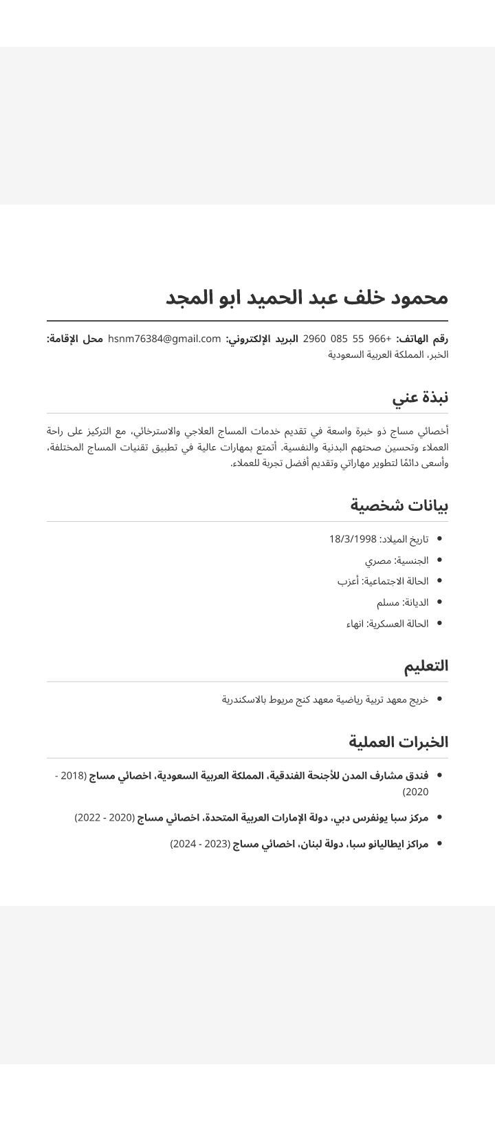 أنا أخصائي علاج طبيعي / 3 أنواع مساج / حجامة. ابحث عن فرصة عمل شرط نقل كفالة