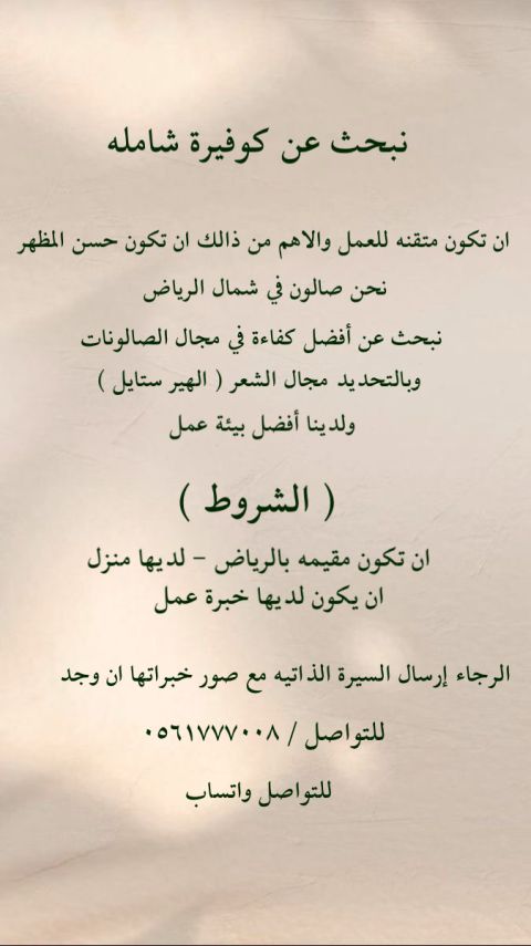 صالون في شمال الرياض حي الياسمين نبحث عن كوفيره شامله الرجاء لا يتواصل الا المقيم في الرياض
