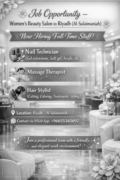 مطلوب لتوظيف الفوري لصالون نسائي في الرياض حي الورود 2 أخصائية اظافر بدكير منكير وجل وأكريلك وكوافيرات تخصص شعر قص وصبغات وتساريح وسيشوار وكوافيرات تخصص رموش وحواجب تركيب ومكياج وعاملات تخصص حمام مغربي نقل كفالة الراتب ونسبة يحدد بعد المقابلة يوجد سكن ومواصلات الطلب لداخل السعودي ولا ل يوجد استقدام خارجي