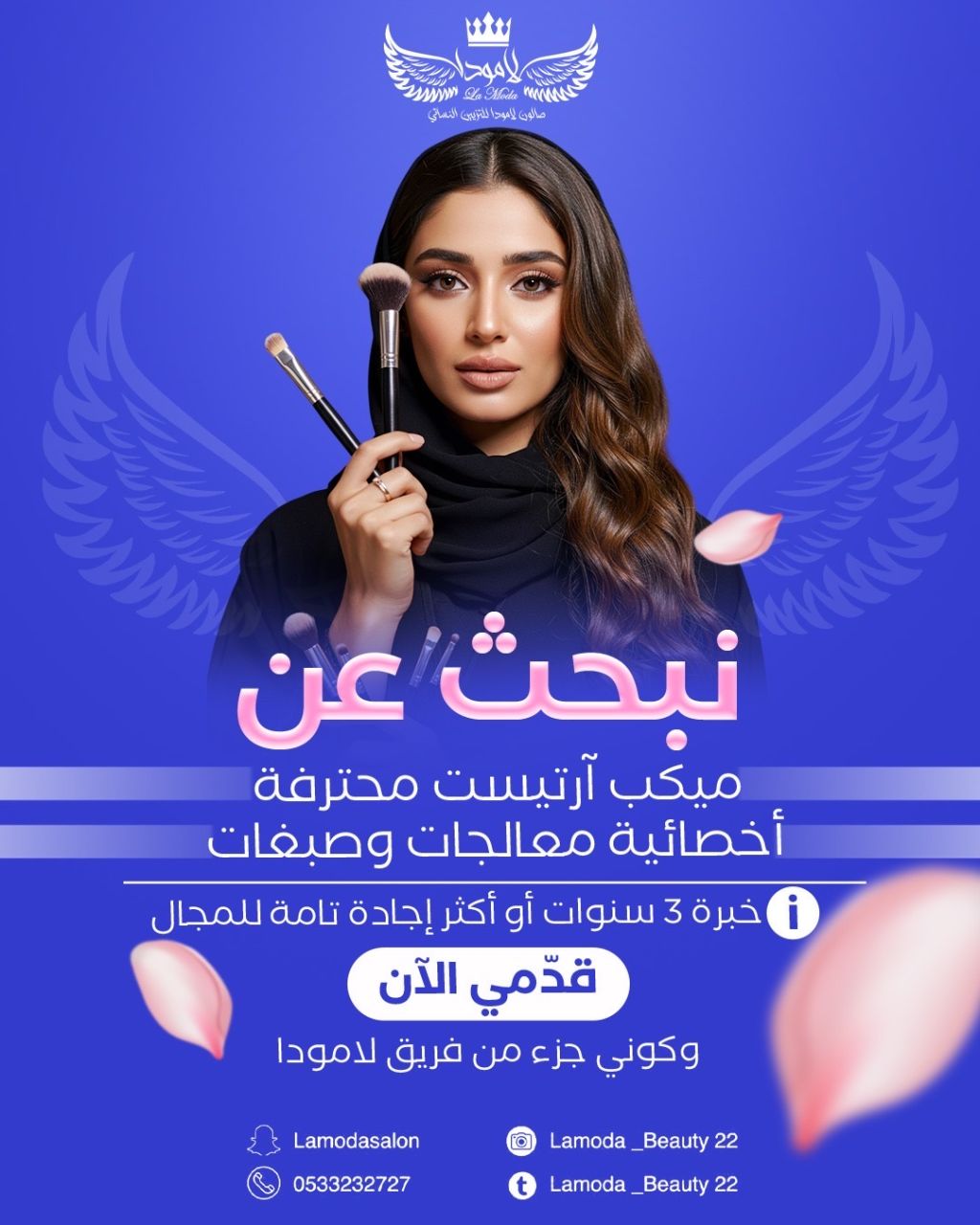 مطلوب للعمل في مركز تجميل أخصائية شعر (سيشوار - سيراميك - تساريح - صبغات - معالجات) ومطلوب ميكب ارتست خبرة اسم صالون التجميل لا مودا للتزيين النسائي في الرياض حي إشبيلية للتواصل واتساب ومكالمات