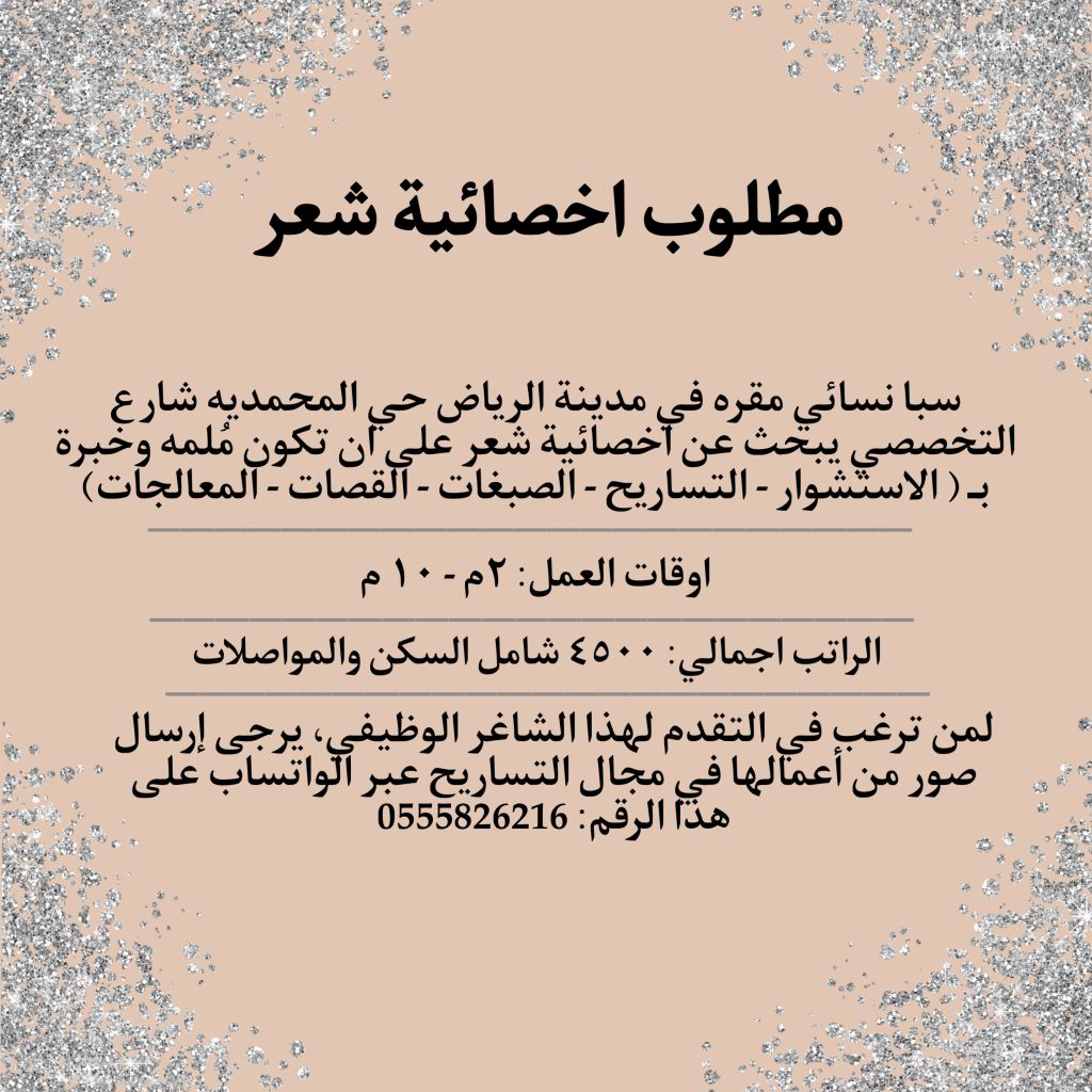 مطلوب أخصائية شعر يرجى الاطلاع على الصورة المرفقه للتفاصيل - موقعنا في الرياض شارع التخصصي