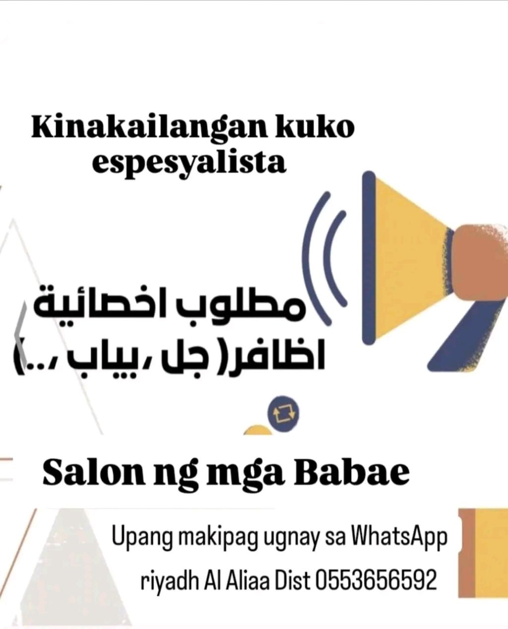 متاح للتوظيف الفوري لصالون نسائي في شمال الرياض حي المحمديه عدد 3 عاملات أخصائية اظافر بدكير منكير وجل وأخصائية شعر قص وتساريح وسيشوار وكوافيرات تخصص رموش عاديه ودائمه ومكياج نقل كفالة أو عقد أجير الطلب للداخل فقط ولا يوجد براتب مجزي ونسبة يوجد سكن ومواصلات