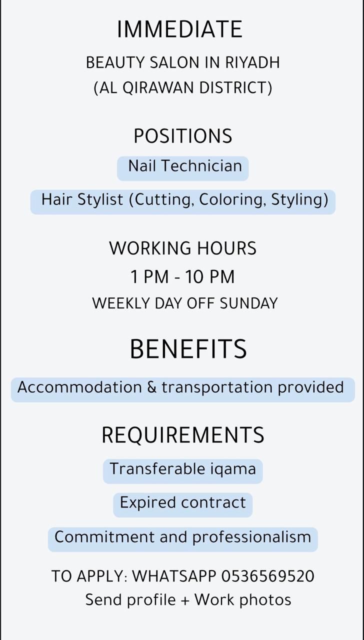 مطلوب للتوظيف الفوري صالون نسائي فاخر في الرياض (حي القيروان) الوظائف المطلوبة أخصائية اظافر (بديكير، منيكير، جل اكستنشن، بياب) أخصائية شعر (قص، صبغات، تساريح، سيشوار) ساعات العمل من 1 ظهرا حتى 10 مساء - إجازة يوم واحد الأحد للتقديم التواصل واتساب مع أرسل صور الشغل