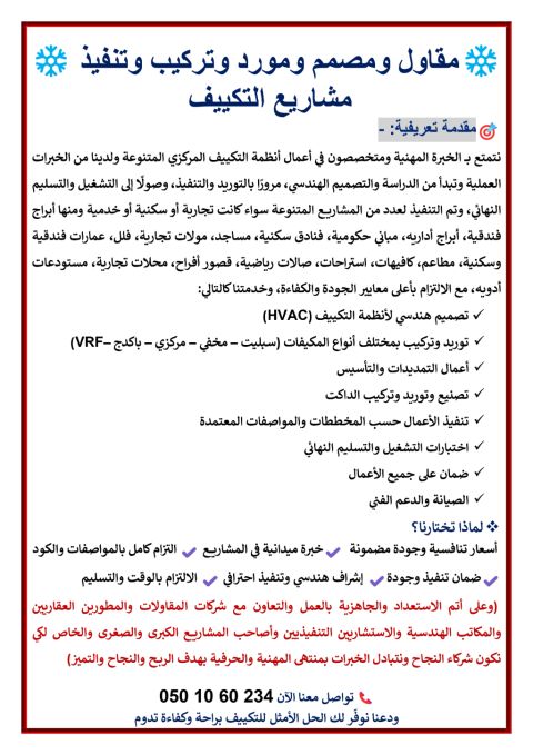 مقاول تنفيذ & مصمم & توريد & تركيب & تمديد وتأسيس مشاريع التكييف مقدمة تعريفية نتمتع ب الخبرة المهنية ومتخصصون في أعمال أنظمة التكييف المركزي المتنوعة ولدينا من الخبرات العملية وتبدأ من الدراسة والتصميم الهندسي، مرورا بالتوريد والتنفيذ، وصولا الى التشغيل والتسليم النهائي، وتم التنفيذ لعدد من المشاريع المتنوعة سواء كانت تجارية أو سكنية أو خدمية ومنها أبراج فندقية، أبراج اداريه، مباني حكومية، فنادق