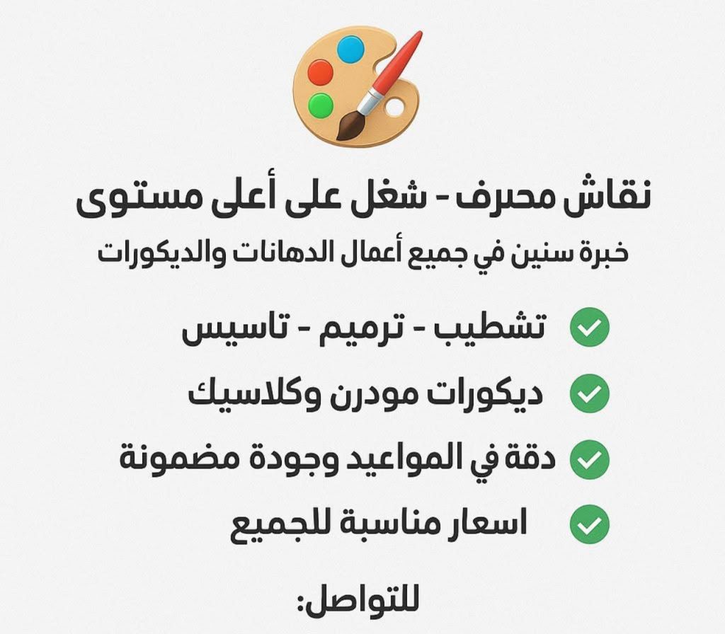 عملاء الكرام أهل الرياض اذا تبغون بيوتكم تزهو بأجمل الالوان حاضر أقدم لكم خدمات دهان المنازل الداخليه والخارجية بأعلى جودة وأفضل الأسعار خبرتي طويله في اختيار الالوان المناسبة لكل مكان سواء مجالس صالات أو واجهات استخدام أفضل أنواع البويات الى تتحمل حرارة ورطوبة الرياض وتدوم لي فترة طويله بدون ماتبهت أو تتغير اضمن لكم شغل نظيف ومتقن والوان عصريه تناسب أذواقكم للتواصل المعلم محمد