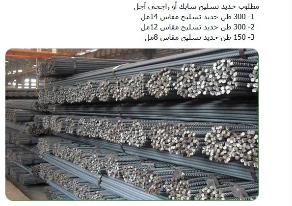 مطلوب حديد تسليح سابك أو راجحي اجل 1 - 300 طن حديد تسليح مقاس 14 مل 2 - 300 طن حديد تسليح مقاس 12 مل 3 - 150 طن حديد تسليح مقاس 8 مل